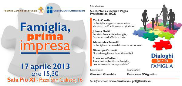 “Famiglia, prima impresa” è il primo dei “Dialoghi per la famiglia”, organizzato dal Pontificio Consiglio per la Famiglia in collaborazione con l’Unione dei giuristi cattolici italiani, mercoledi 17 aprile, a partire dalle ore 15.30, presso il nostro Dicastero (Sala Pio XI, Piazza di San Calisto 16) .