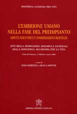 HOME POR » Quem somos » Presidência  » Secretário » Bibliografía » Libros editados por S.E. Mons. Elio Sgreccia con Mons. Jean Laffitte  » L’embrione umano nella fase del preimpianto, aspetti scientifici e considerazioni bioetiche, Atti della dodicesima Assemblea Generale della Pontificia Accademia per la vita (Libreria Editrice Vaticana, 2007)