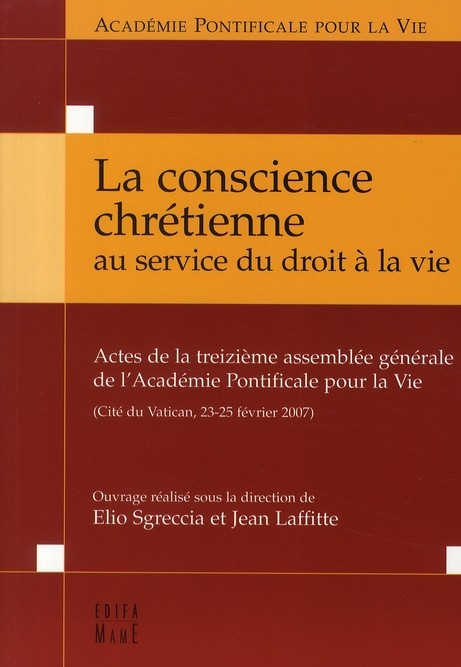 HOME POR » Quem somos » Presidência  » Secretário » Bibliografía » Libros editados por S.E. Mons. Elio Sgreccia con Mons. Jean Laffitte  » La conscience chrétienne au service du droit à la vie, Actes de la treizième Assemblée générale de l’Académie Pontificale pour la Vie (Edifa Mame, Paris 2008)